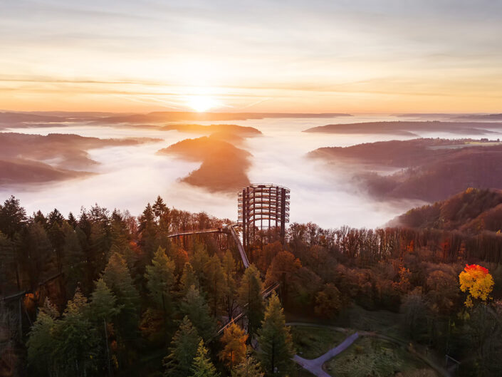 Direkt hinter dem Cloef-Atrium befindet sich der Eingang und die Kasse des Baumwipfelpfads. Dieser schlängelt sich über 1.200 Meter zwischen den Bäumen hoch zum Aussichtsturm. Ich war im Herbst dort zu Besuch, zwischen Nebelschwaden und Bäumen, und war begeistert. Am Ende erreicht man den Aussichtsturm – der Ausblick ist grandios. Der Besuch ist auch mit Kinderwagen und Rollstuhl möglich, nur Hunde dürfen (außer Assistenzhunden) nicht mit.