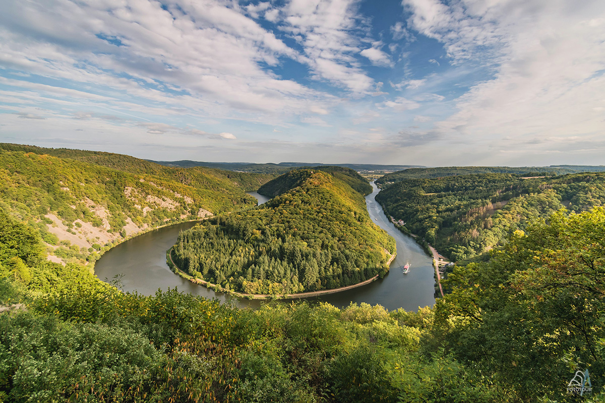 Doch was genau macht diese Landschaft so einzigartig? Ich liebe Orte, an denen kaum menschliche Spuren zu sehen sind, die aussehen, als stünde man in den Weiten Kanadas oder Norwegens. Genau so ein Ort ist die Saarschleife Cloef. Die Saar verläuft hier in einem engen, fast perfekten 180-Grad-Bogen und windet sich an Felsen und dicht bewachsenen Wäldern vorbei. Es sind nur wenige menschliche Relikte sichtbar, als stünde man mitten in den Weiten Kanadas. Am Scheitelpunkt der Flussschleife liegt der Aussichtspunkt, 180 Meter über der Saar. Daher benötigt man hier keine Drohne, um die Saarschleife aus erhöhter Perspektive fotografieren zu können. Das Aussichtsplateau Cloef liegt auf 330 Metern über Null.